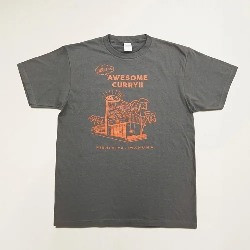 ニシキヤキッチンのスタッフが制服として着用しているネイビーのTシャツの色違い、チャコールグレーのTシャツです。どなたでも肌馴染みの良いチャコールグレーに朱色のプリントが映えるデザイン。通常は工場見学でしか買えない限定品です。