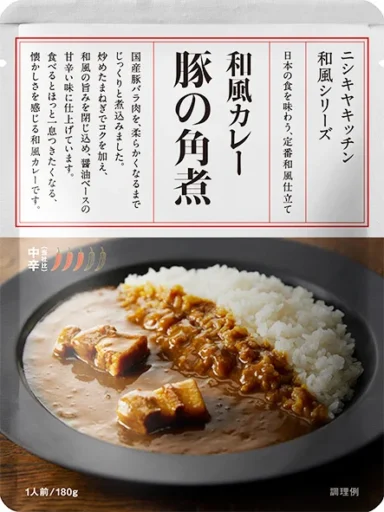 ゴロッと入った国産豚バラ肉を旨みたっぷり醤油ベースの甘辛カレーで柔らかく煮込みました。